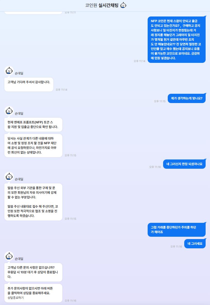 2. 2024년 4월경 NFP코인은 기존 코드를 삭제하고 새로운 코드로 재발급을 하였다. 헌데 코인원이 보유중인 NFP 코인은 9개월이 지났지만 현재까지도 재발급 받지못해 사실상 NFP코인이 아님에도 불구 하고 거래소에 버젓이 현재 유통되고 있고 NFP코인 인거마냥 정보를 제공하고 거래소를 운영중이다.