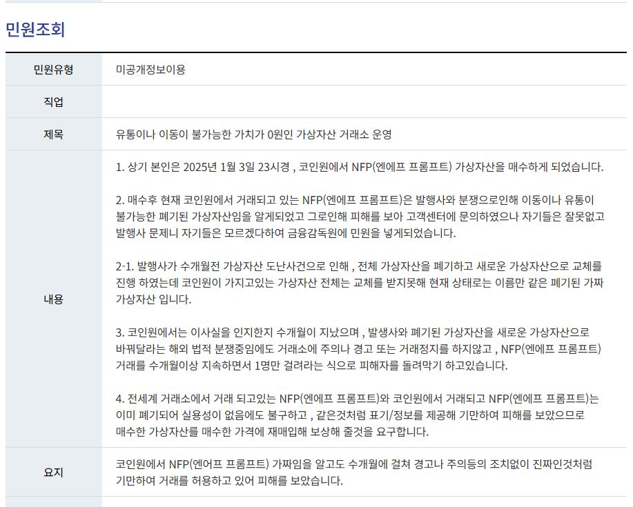 코인원 coinone NFP 피해 보상 금감위 민원 신고
