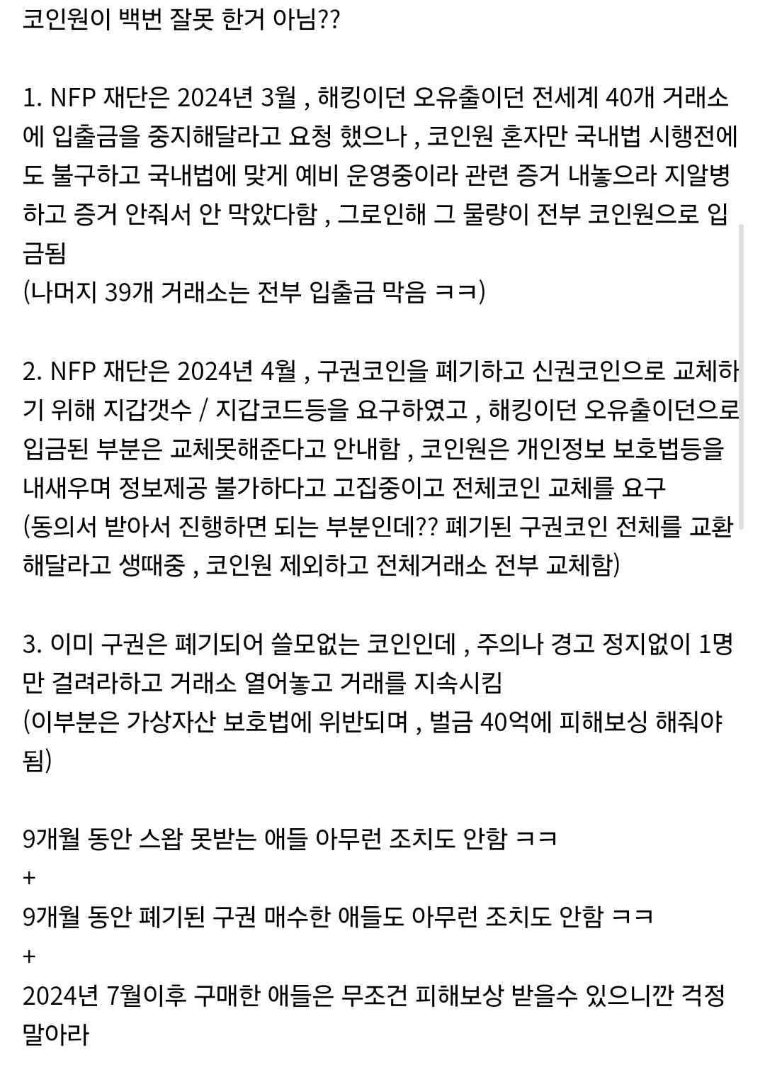 5. 코인원 coinone 본인들 말로는 2024년 4월부터해서 ~ 현재까지 , NFP 발행사 재단과 새로운 코드의 코인으로 교환받기 위해 협의 / 해외 법정 소송을 진행하고 있다는데... 그런 사정은 둘째이고 , 이미 코드가 삭제되고 폐기되어 유통이 불가능한 코인을 9개월째 아무런 조치없이 방치 하는것은 피해자 돌려막기 뿐이 되지 않는다. [가상자산 이용자 보호법] 위반