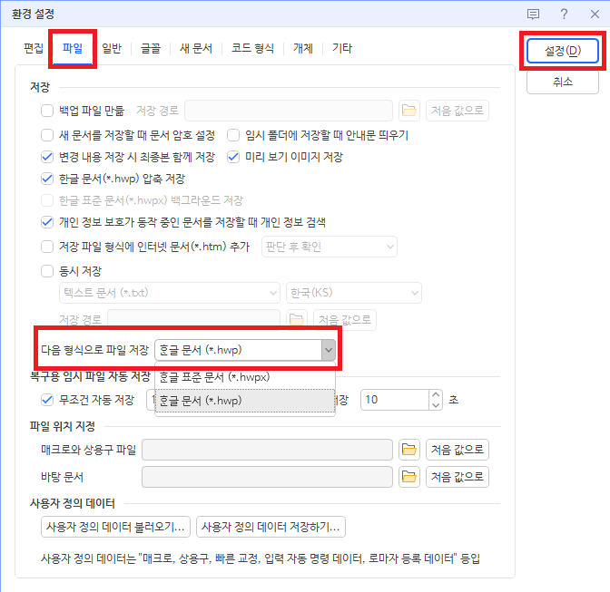 - 한컴오피스 실행 -> 도구 -> 환경설정 -> 파일 -> 다음 형식으로 파일저장 hwp 선택 -> 설정