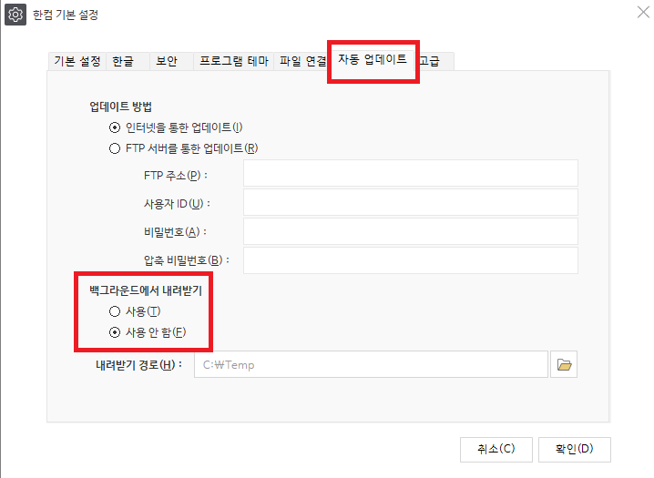 - 윈도우 검색창 -> 한컴 기본 설정 2024 -> 사용자 설정 -> 자동 업데이트 -> 백그라운드 내려받기 사용 안함
