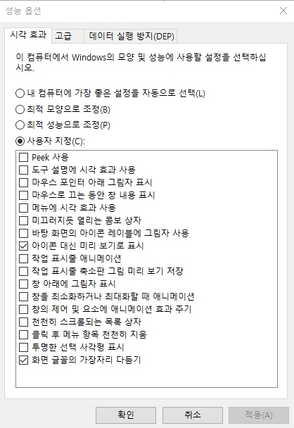 6. 아이콘 대신 미리보기로 표시 (v) , 화면 글꼴의 가장다리 다듬기 (v)