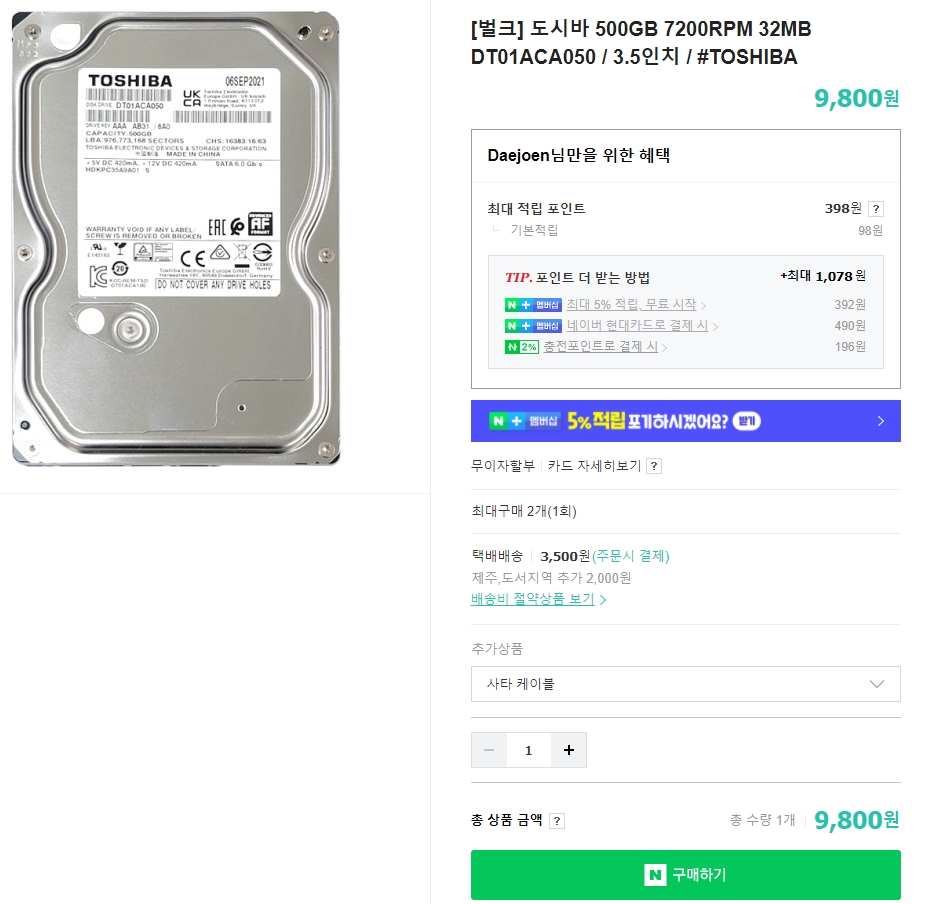 - HDD 3.5인치 500G 신품 13,500원 2022.03.06